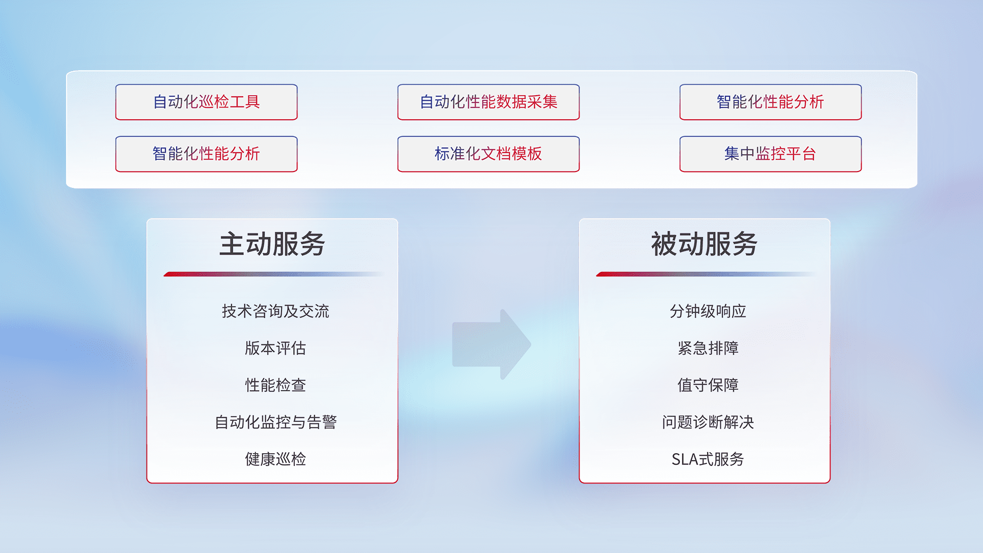 智能化工具和标准化文档,,,保障服务质量,,提供主动服务(包含技术咨询、、版本评估、、、性能检查、、自动化监控与告警、、、健康巡检)和被动服务包含(分钟级响应、、、紧急排障、、、、值守保障、、、问题诊断解决、、、SLA服务)。。