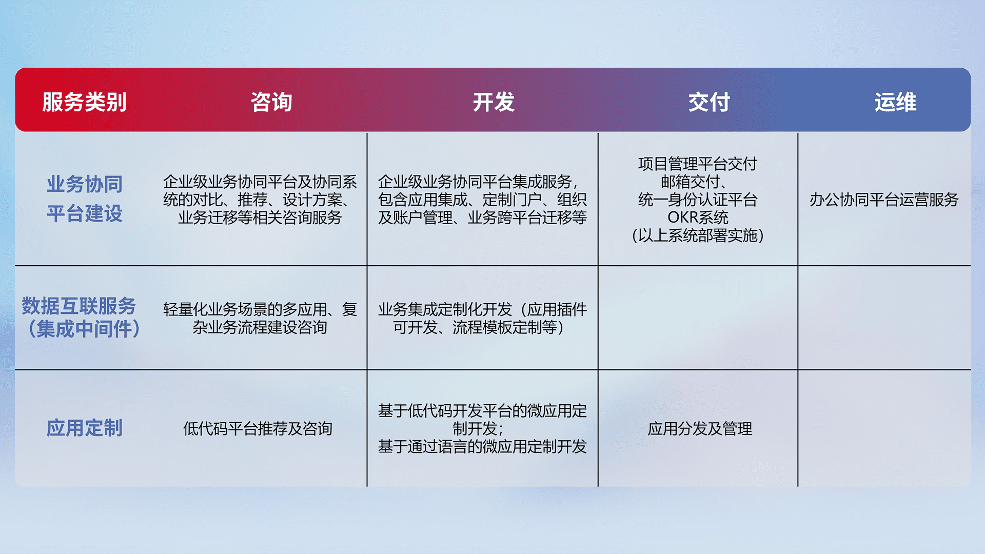 针对钉钉、、、企微、、、、IDaas等平台级产品提供产品的规划、、、方案、、交付、、、、定制化开发等服务,,,实现如统一协同办公、、智能客户服务、、、混合会议管理、、、智能数据查询、、等业务场景,,实现数字化转型。。。